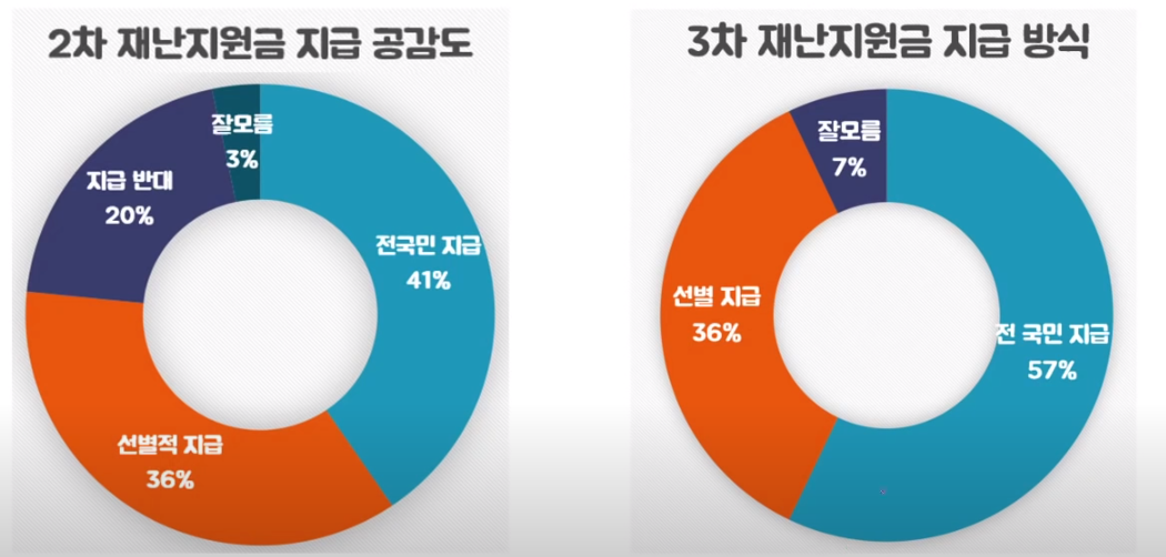 이렇게 지급된 재난지원금에 대한 지급 공감도에 대한 내용을 살펴보면 2,3차 재난지원금의 선별지급 방식으로 인해 4차 재난지원금의 지급방식은 전 국민 지급으로 진행되어야 한다는 국민들의 의견이 많아지고 있습니다.