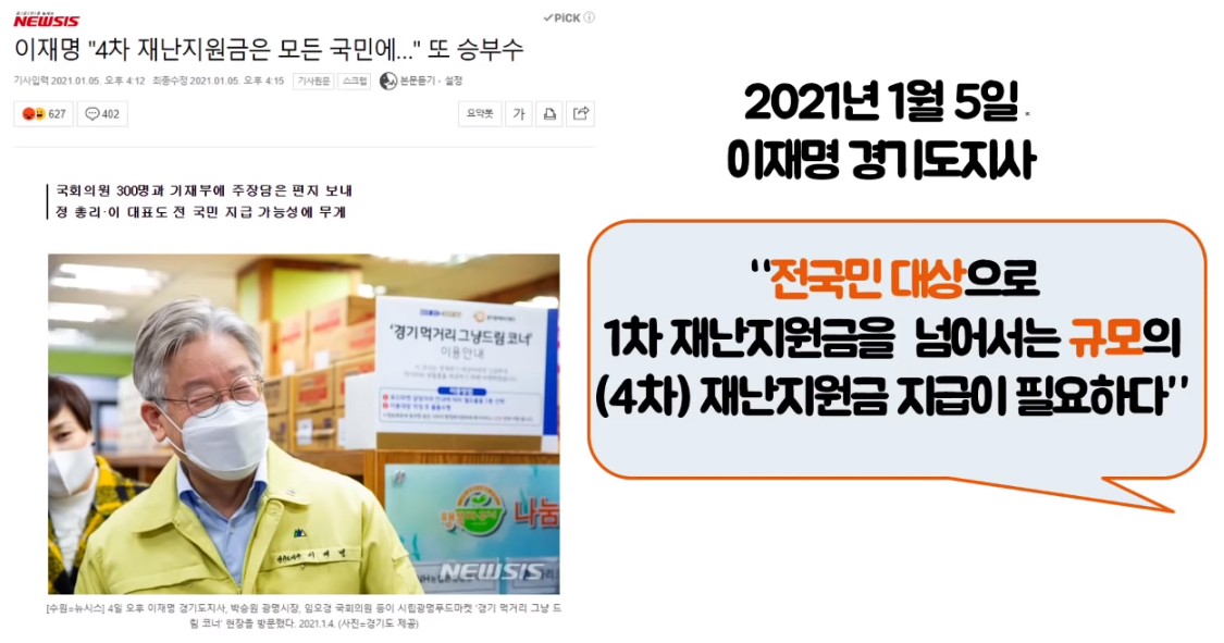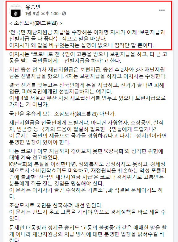 국민의 힘 유승민 전 의원은 지난 2021년 1월 9일 페이스북에서 이 지사를 향해 “선거를 앞두고 있으니 4차 재난지원금을 가자는 거 아닌가”라며 “국민을 우습게 보는 조삼모사”라고 비판했습니다.