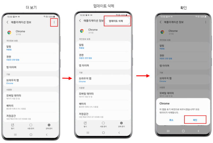 설정 > 애플리케이션 > Chrome 선택 > 더 보기(우측 상단 점 3개) > 업데이트 삭제