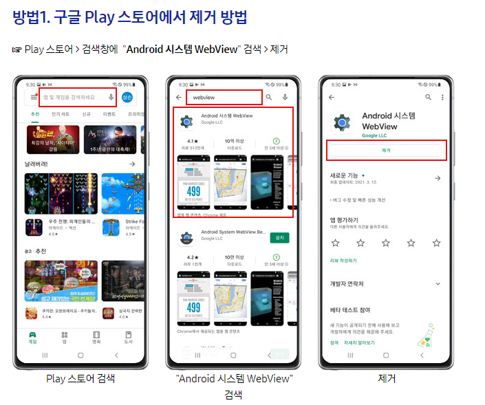 - 방법 1 : Play 스토어 > 검색창에 "Android 시스템 WebView" 검색 > 제거