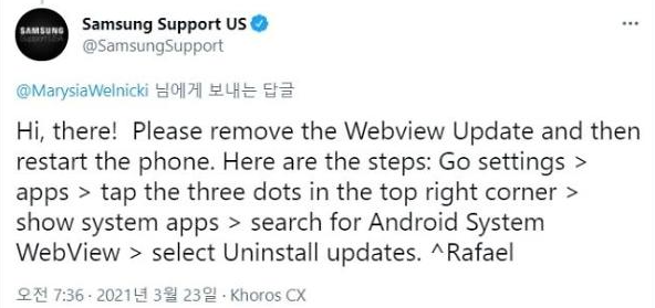 이에 삼성 측은 공식 트위터를 통해 해결법을 공유했고, 먼저 스마트폰 '설정'에서 '애플리케이션' 메뉴에 들어간 뒤 ‘안드로이드 시스템 웹뷰(Android System WebView)’를 영어로 검색한 뒤 오른쪽 상단에 있는 메뉴 탭을 눌러 '업데이트 삭제'를 실행하고 단말기를 재부팅하면 된다고 합니다. 이는 최신 업데이트 버전만 삭제하는 것으로, 앱 자체가 삭제되는 것은 아니라고 하니 참고하시길 바라겠습니다.
