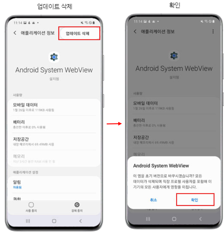 안드로이드 10 OS 이하 : 설정 > 애플리케이션 > 더 보기 > 시스템 앱 표시 > "Android System WebView" 선택 > 더 보기(우측 상단 점 3개) > 업데이트 삭제