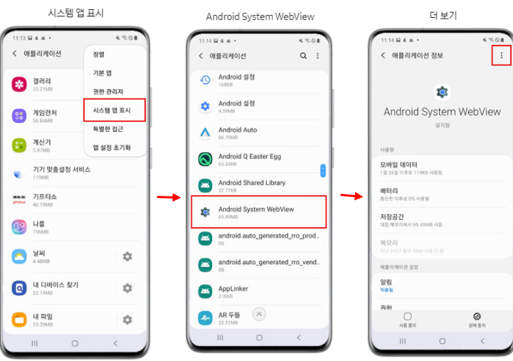 안드로이드 11 OS : 설정 > 애플리케이션 > 앱 목록() > 시스템 앱 표시 설정 켜기 > "Android System WebView" 선택 > 더 보기(우측 상단 점 3개) > 업데이트 삭제